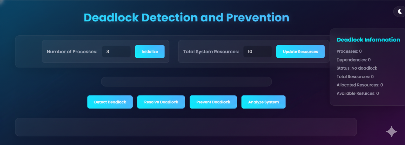 A full-stack Deadlock Detection System built using HTML, CSS, and JavaScript. It simulates and detects deadlocks in operating systems through a clean, interactive interface. Features include real-time deadlock detection, visual representation of resource allocation, and step-by-step analysis to help users understand complex OS concepts easily.